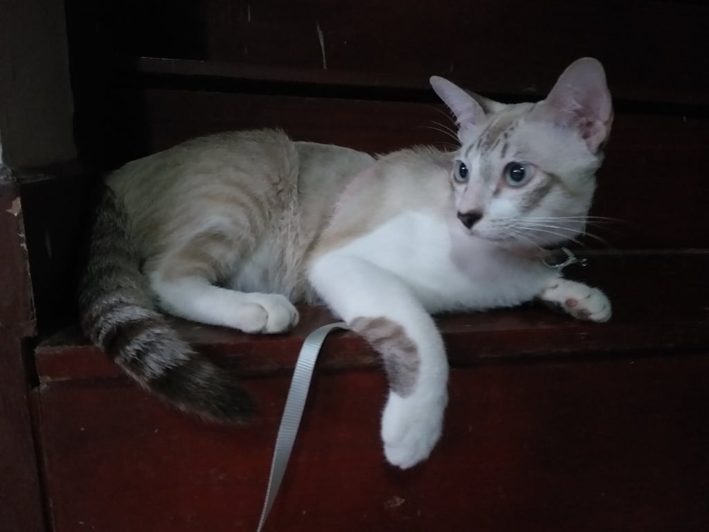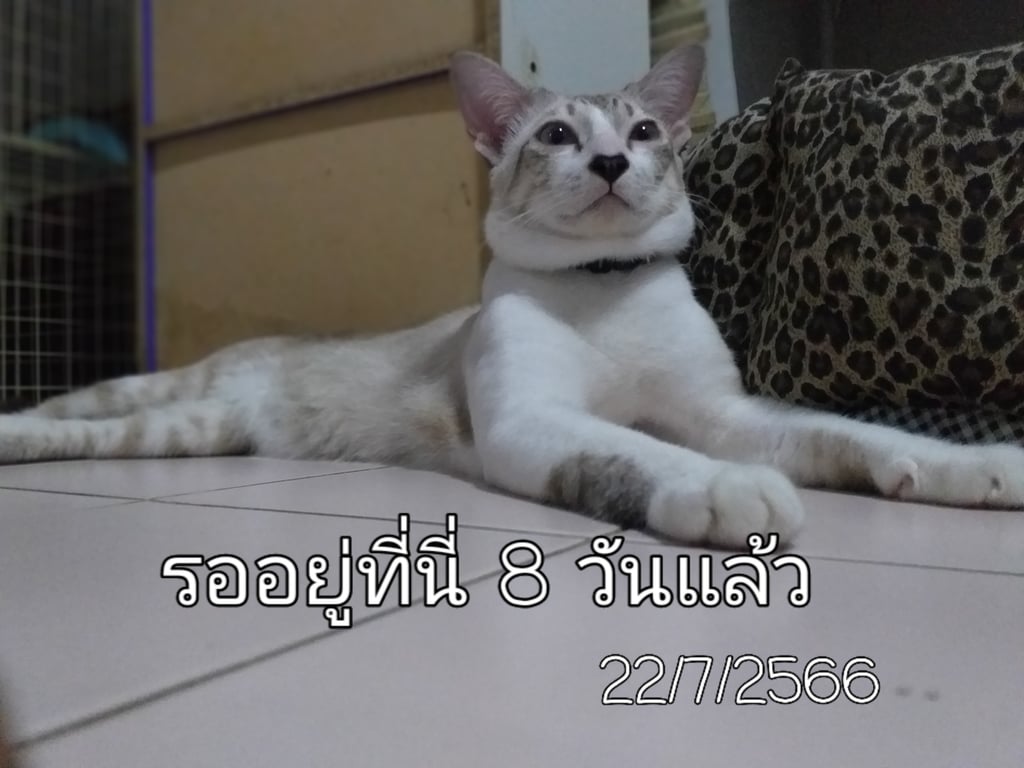 แมวผู้ วัยประมาณ 5-7 เดือน ยังไม่ทำหมัน ปลายจมูกเป็นรูปหัวใจสีดำ ตาสีฟ้า สีตัวขาวนวล ลายสีเทาที่ขา