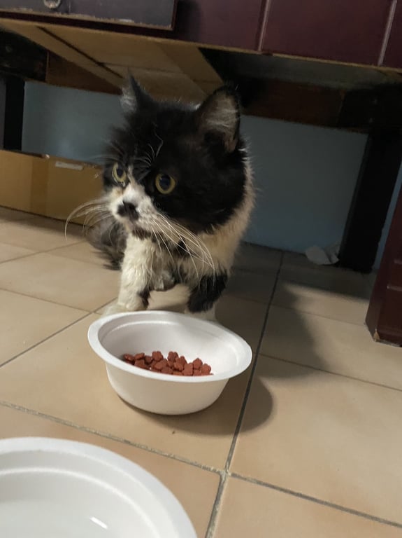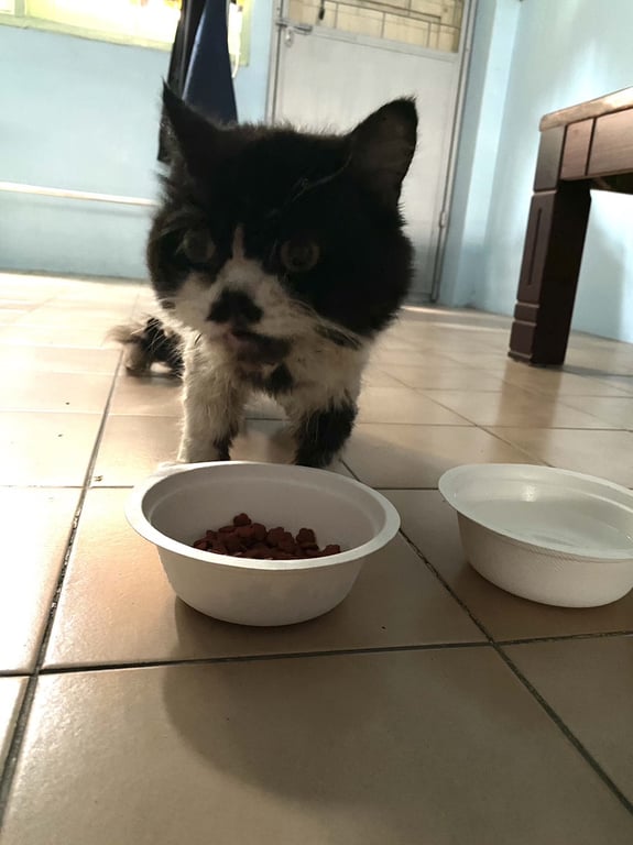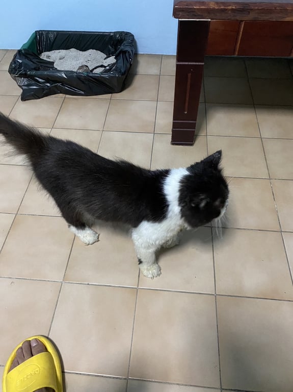 แมวสีขาวดำ หน้าเหมือนใส่หน้ากากสีดำ มีสีดำตรงจมูกเหมือนมีหนวด ขาคู่หน้าสีขาว มีสีดำหน้าขาซ้าย ขาคู่หลังสีดำใส่ถุงเท้าสีขาว