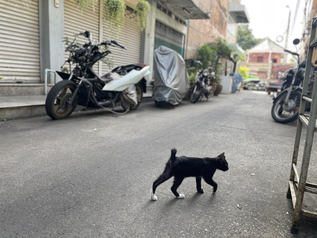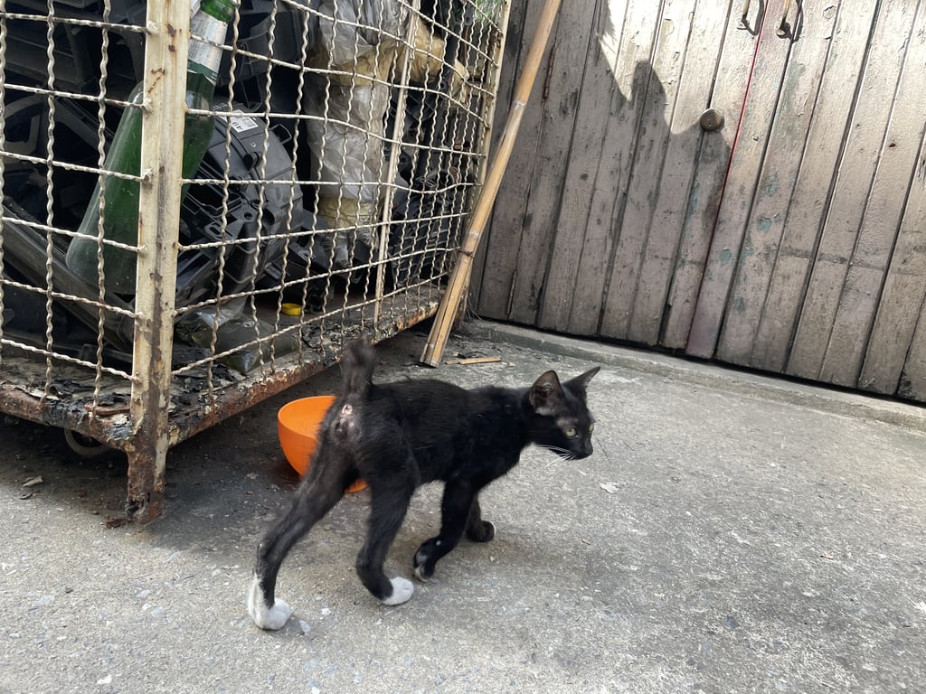 ลูกแมวอายุไม่เกิน 3 เดือน สีดำมีจุดขาวที่เท้า หางกุด เข้าใกล้ได้แต่ไม่ให้จับ