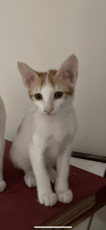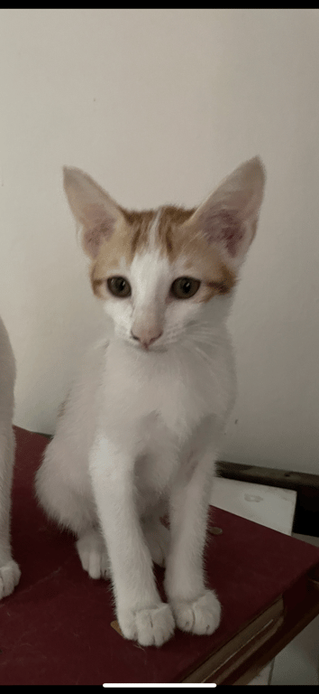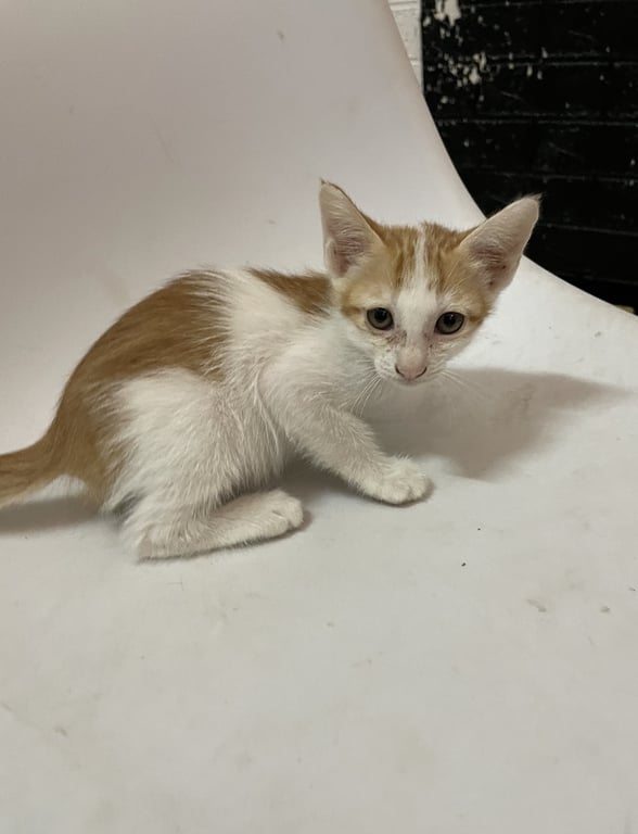 ลูกแมวประมาณ3เดือน สีขาวส้มเพศเมีย หน้าตาน่ารัก เป็นมิตร เข้ากระบะทรายเป็นแล้ว ทานอาหารเม็ดได้