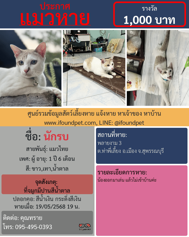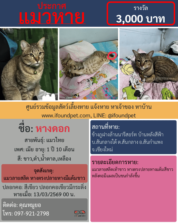 วันนี้ i FOUND PET ได้รวบรวมข้อมูลประกาศที่มีการแจ้งพบแล้วมาให้ไดัดูเป็นแนวทางกันครับ ว่าแต่ละท่านมีวิธีการตามหาน้องๆ อย่างไรกันบ้าน ถึงได้พาน้องๆ กลับบ้านได้ครับ