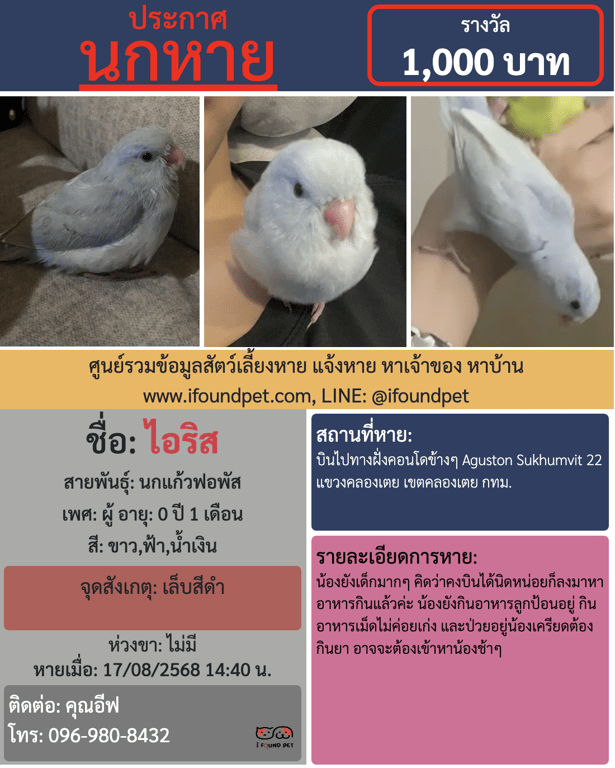 วันนี้ i FOUND PET ได้รวบรวมข้อมูลประกาศที่มีการแจ้งพบแล้วมาให้ไดัดูเป็นแนวทางกันครับ ว่าแต่ละท่านมีวิธีการตามหาน้องๆ อย่างไรกันบ้าน ถึงได้พาน้องๆ กลับบ้านได้ครับ