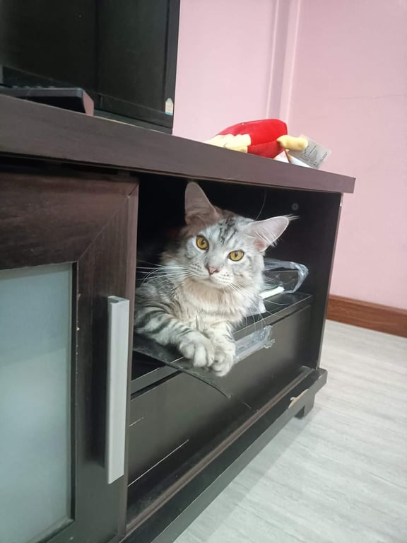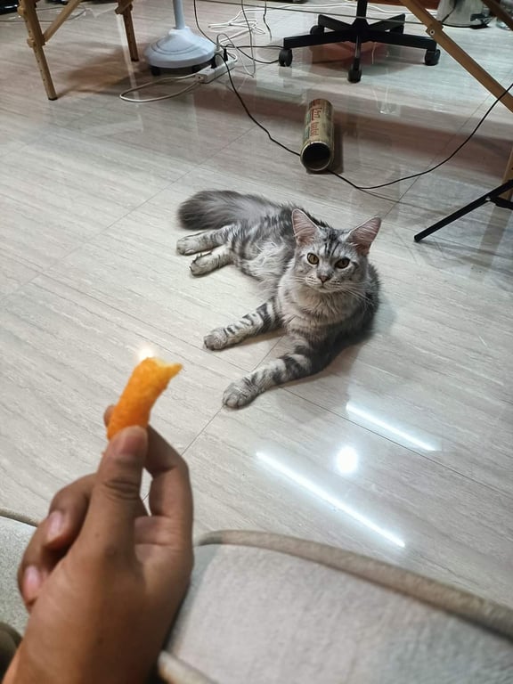 รอยตำหนิ: ตาสีเหลือง หางยาวฟู ขนยาว ตัวใหญ่นิสัย คุ้นชินกับคน แต่ไม่รู้ว่าออกไปข้างนอกแล้วเป็นยังไง