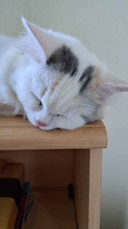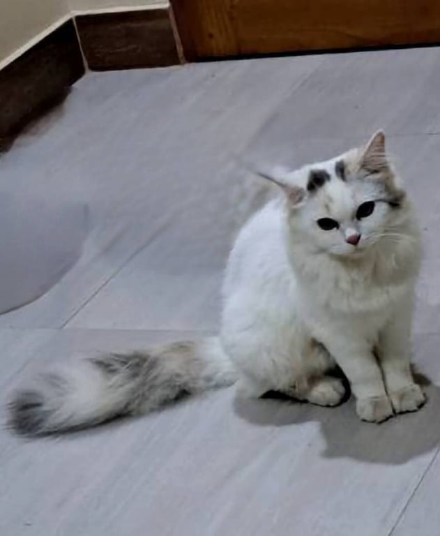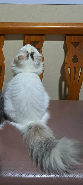 รอยตำหนิ: ที่หัวมีจุดดำ 2 จุด หางสามสีซน อุ้มได้ ไม่กัด ขี้อ้อน