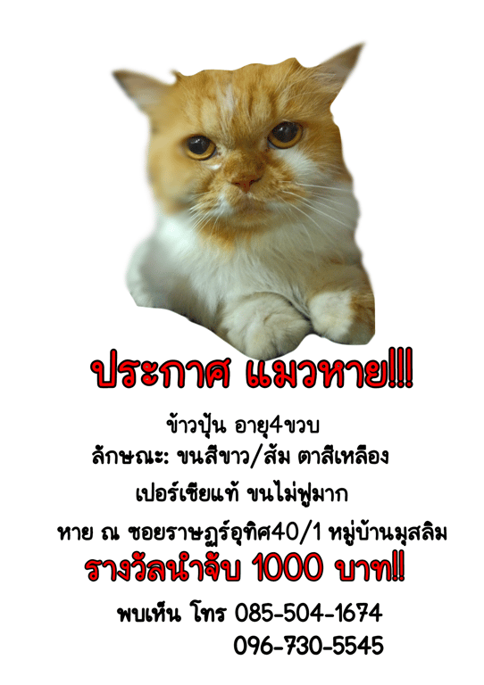 รอยตำหนิ: หน้าน้องจะดุๆนิดหน่อย ผอม ขนไม่ยาวมาก หางส้มน้องเคยเป็นโรคฉี่ไม่ออก มักจะฉี่ไม่เป็นที่ ฉี่เป็นหยดๆ ไม่ค่อยชอบให้เกาพุง กลัวคน(ยกเว้นเจ้าของ) น้องผอมมาก และขี้โมโห
