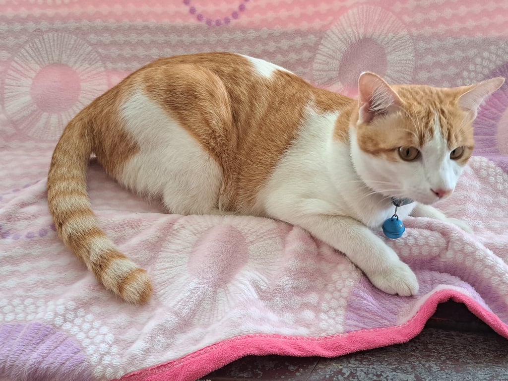 สี: แมวสีส้ม สลับขาว ส่วนหลังเป็นสีส้ม ส่วนท้องขาว