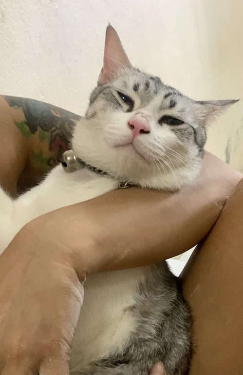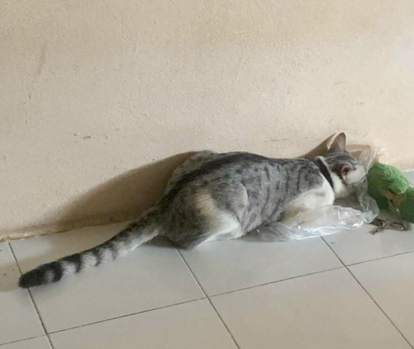 รอยตำหนิ: ปอกคอสีดำลายผ้าพันคอขี้กลัว ขี้ตกใจสัตว์ ปอกคอสำดำลายผ้าพันคอ จมูกชมพู ขายาว ลายสลิด อายุปีกว่า