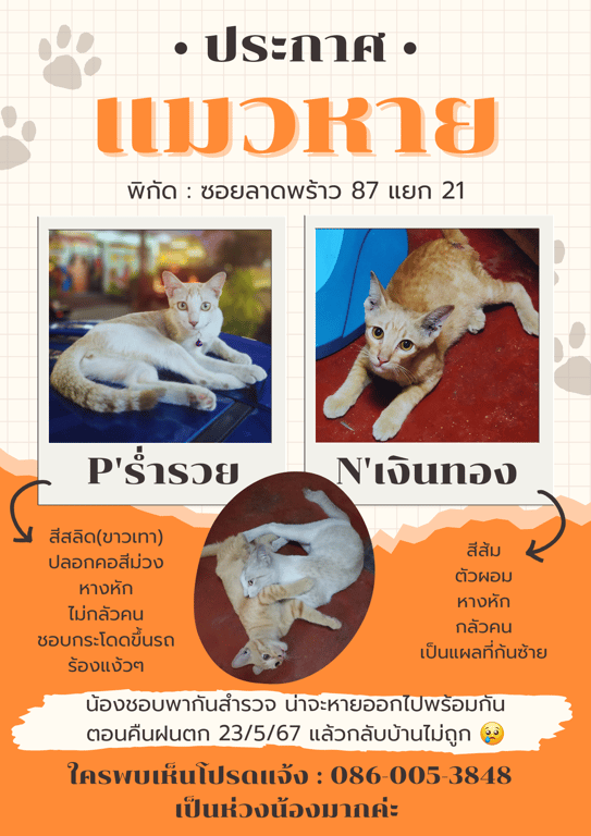 รอยตำหนิ: หางหัก แผลที่ก้นซ้ายกลัวคน คนเข้าใกล้แล้ววิ่งหนี
