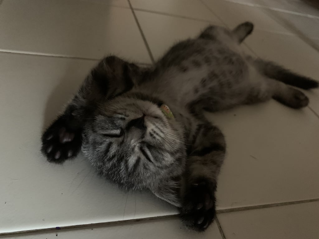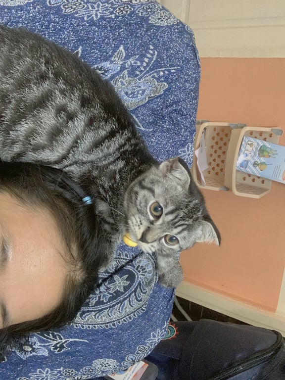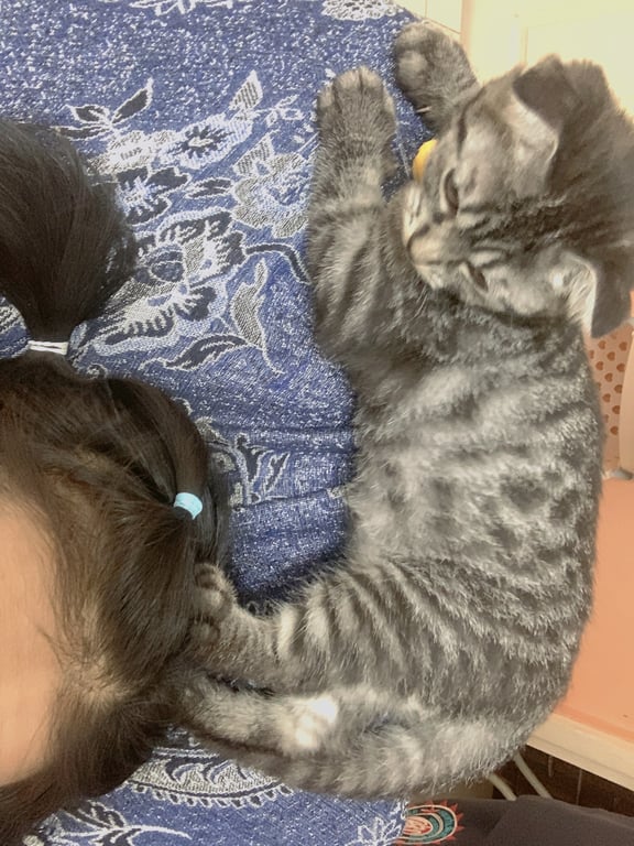 รอยตำหนิ: พันธุ์สก๊อตติชโฟล์ด หูพับ สร้อยคอม่วงกระดิ่งเหลืองชื่อยอน พันธุ์สก๊อตติชโฟล์ด หูพับ กระดิ่งที่คอสีเหลือง ลายสลิด
