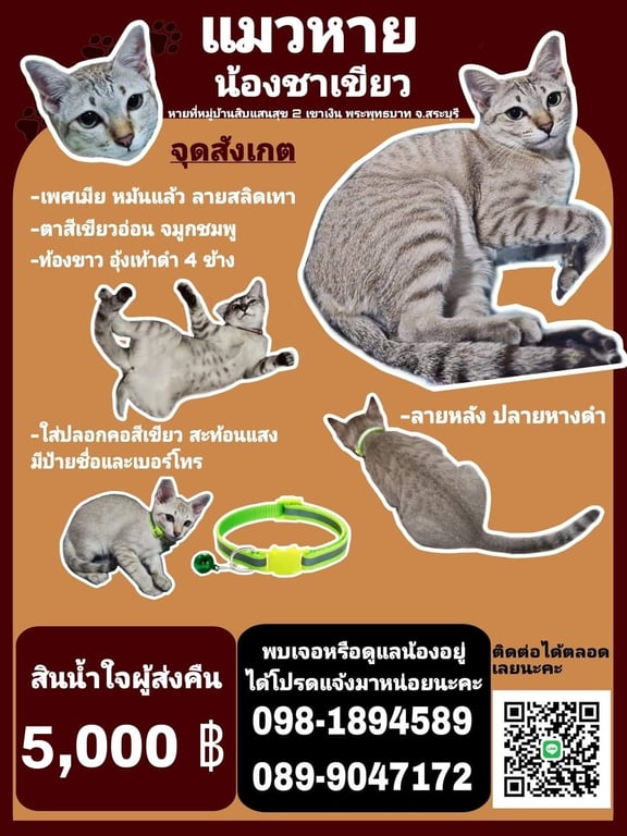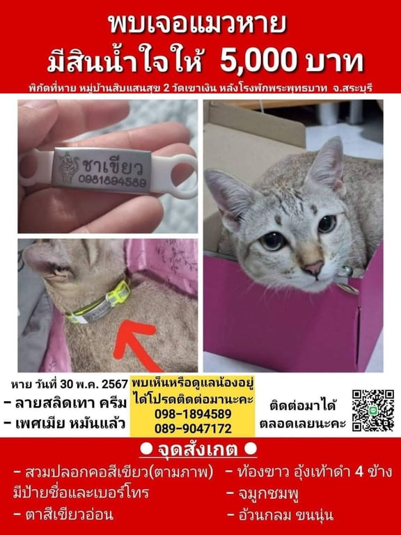 รอยตำหนิ: สวมปลอกคอสีเขียวนีออน สะท้อนแสง มีป้ายชื่อ ชาเขียว พร้อมเบอร์น้องชอบนอนยืดขาหน้า 2 ข้างขี้กลัวมาก กลัวคนแปลกหน้า ฝนตก ฟ้าร้อง น้องจะกลัวมากๆ