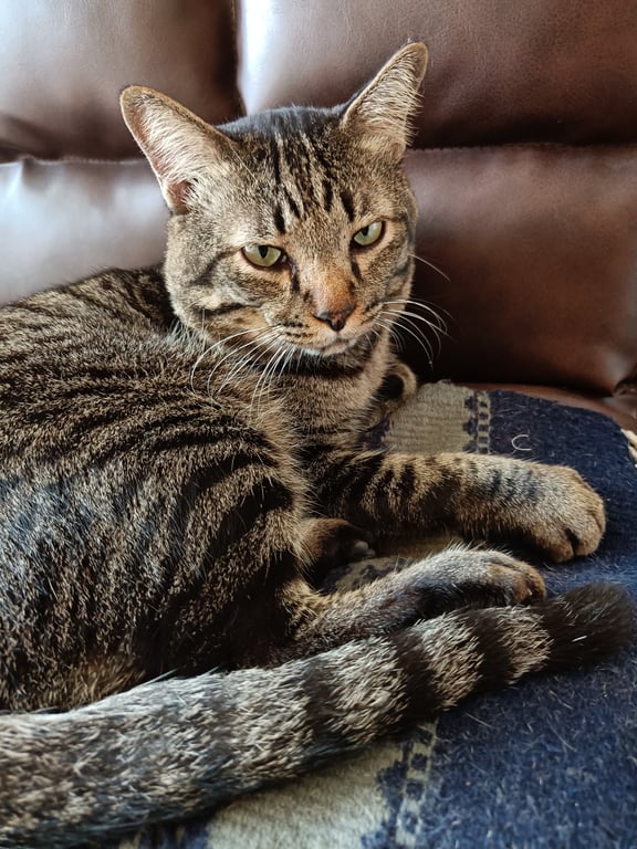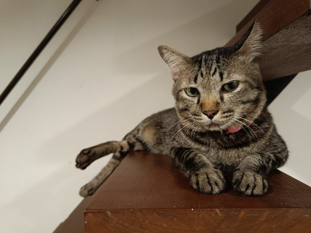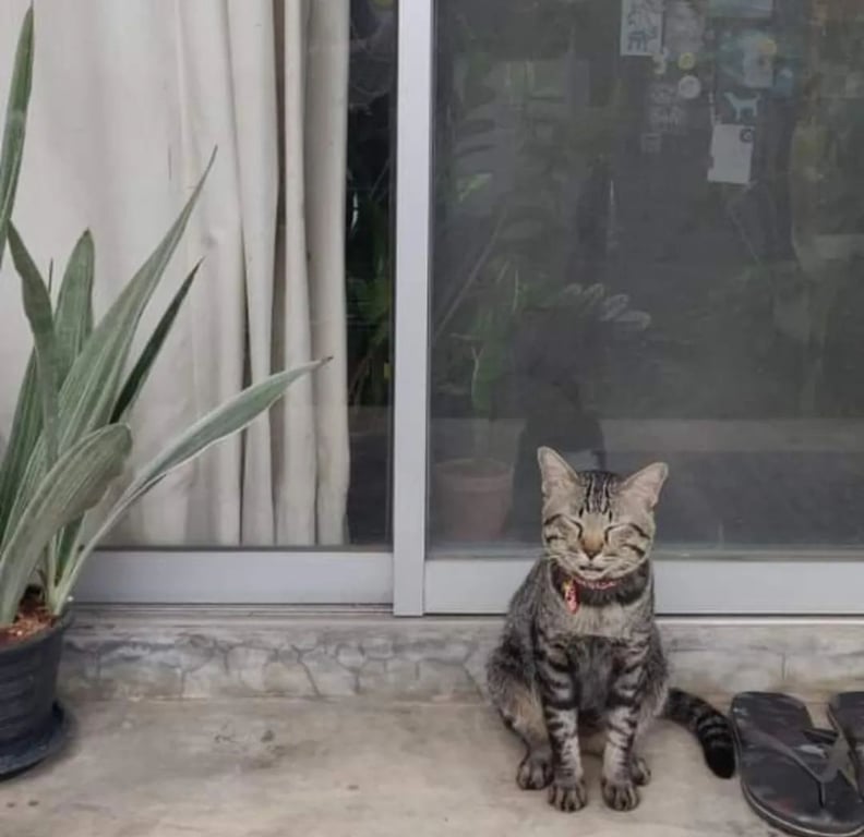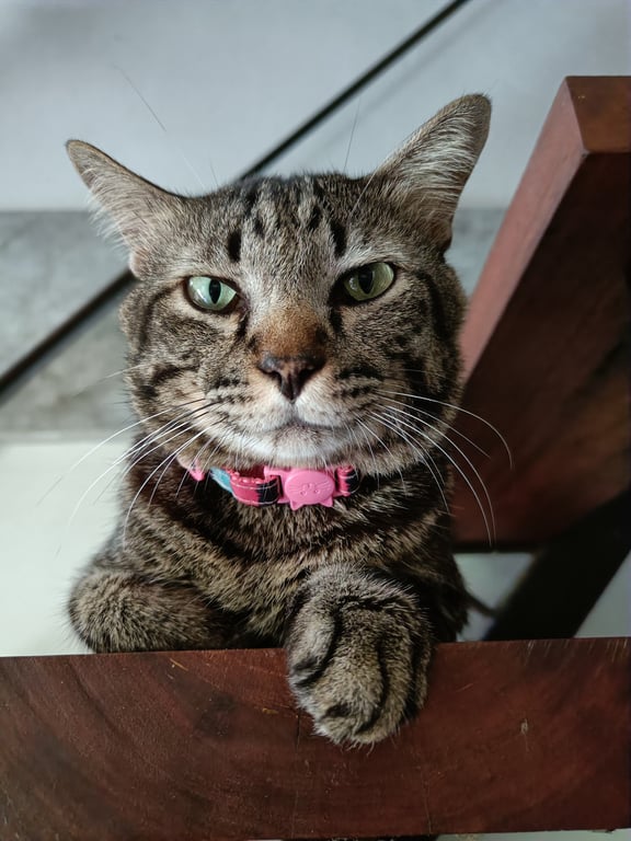 รอยตำหนิ: หน้ากลมๆ,ใจดี ,ไม่กลัวคน,ขี้อ้อน, นิสัยดีเรียบร้อย,ลายสลิดเข้มๆ ตรงหลังคอจะมีรอยแผลเป็นเคยโดนกัด