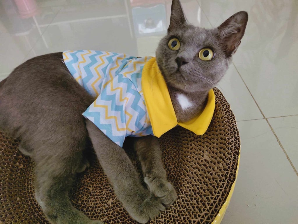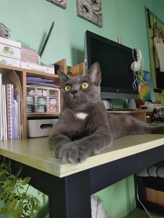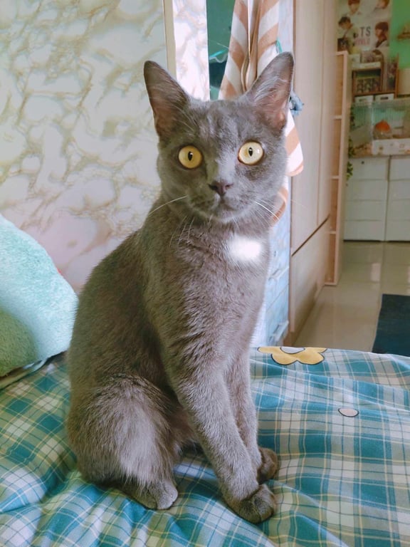 รอยตำหนิ: น้องมีลักษณะจุดเด่นสีขาวตรงหน้าอกบนขาหน้าดวงตาสีเหลืองออกส้มหางตรงไม่คดงอนิสัยขี้กลัวมากค่ะ น้องจะชอบซ่อนตัวเวลามีเสียงดัง เข้ากับตัวอื่นไม่ได้ โดยรวมน้องเป็นแมวนิสัยน่ารัก