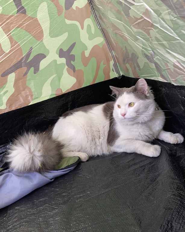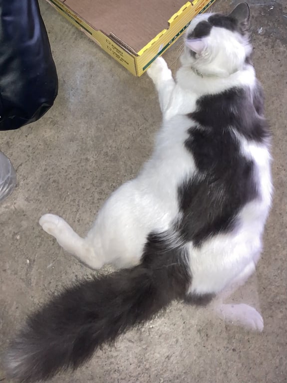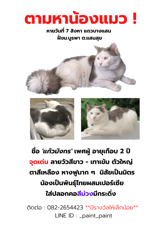 รอยตำหนิ: หางฟู ตาสีเหลือง ตัวใหญ่ ลายวัว ขนยาวนิสัยเป็นมิตร พันธุ์เปอร์เซีย-ไทย