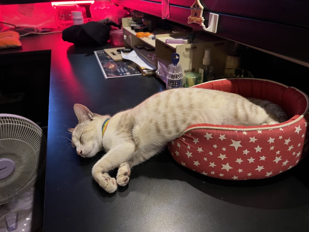 รอยตำหนิ: โคนหางโดนโกนขน มีรอยเส้นตรงคิ้วอายุประมาณ 4-5 เดือน ปลอกคอสีรุ้งกระดิ่งสีม่วง หางยาวสวย ร้องเสียงเบา