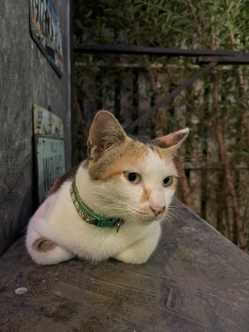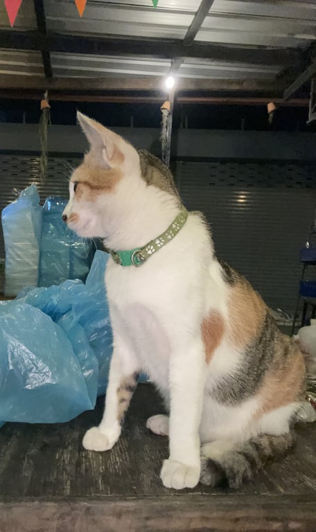 รอยตำหนิ: มีปานดำตรงจมูก แมวสามสีปลอกคอสีเขียวกระดิ่งหลุดหาย