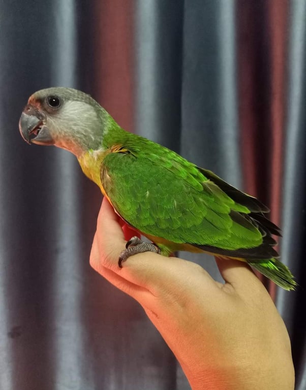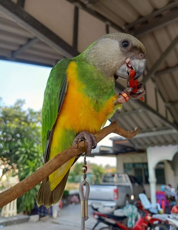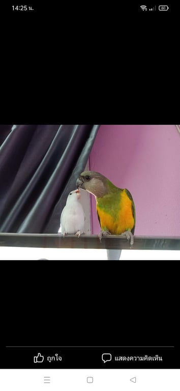 รอยตำหนิ: น้องมีชื่อที่ข้อขาและเบอร์โทเจ้าของนกแก้วสีเขียว หน้าอกน้องจะเหมือนนกใส่เสื้อกั๊กส้มเหลือง หางสั้น