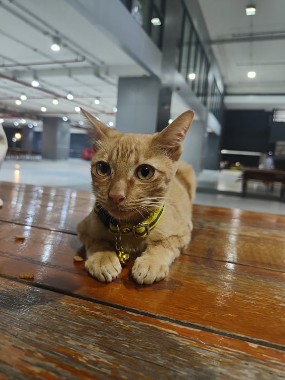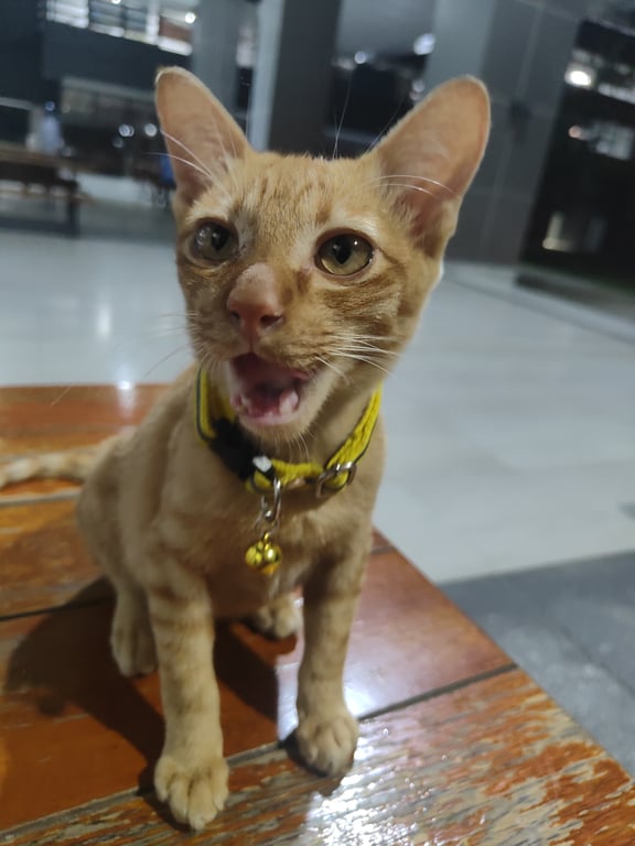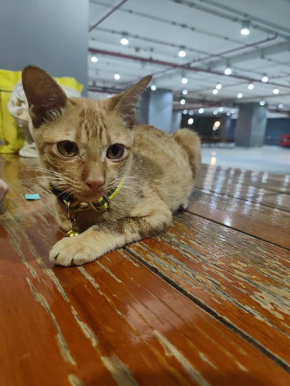 รอยตำหนิ: ปากแหว่ง ฟันกำลังขึ้นใส่ปลอกคอสีเหลือง ปกติจะนอนที่ตึก จุฬาพัฒน์14 เป็นแมวประจำตึก