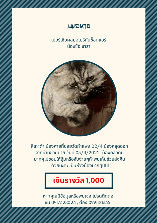 รอยตำหนิ: สีเทาดำซาร่ากลัวคนมากและไม่ชอบให้อุ้มหรือจับ ค่อนข้างดุนะคะ ไม่ได้ใส่ปอกคอ