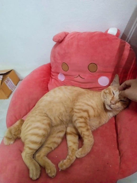 **ลักษณะ** -เพศผู้ -ตัวสีส้มลายแมวกาฟิว -มีหางสั้นม้วนเป็นเกลียว -ใส่ปลอกคอสีเขียววิบวับไม่มีกระดิ่ง -ตัวใหญ่ยาว -น้องเข้ากับคนง่าย -เวลาหิวจะร้องเสียงดังมากตลอดเวลา -ชื่อทาโร่ หรือเรียกว่า"ตังแง่ว"