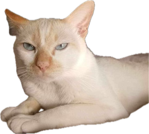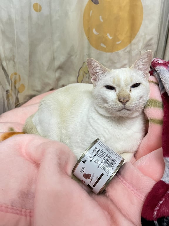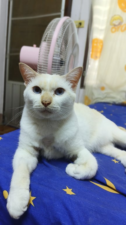 รอยตำหนิ: ตาสีฟ้า หูสีเหลืองอ่อน หางสีเหลืองอ่อน(หางคต) มีแผลตามตัว2-3จุดมีลักษณะขี้กลัวตื่นคนชอบหลบในซอกเหลือบหรือในที่แคบๆ