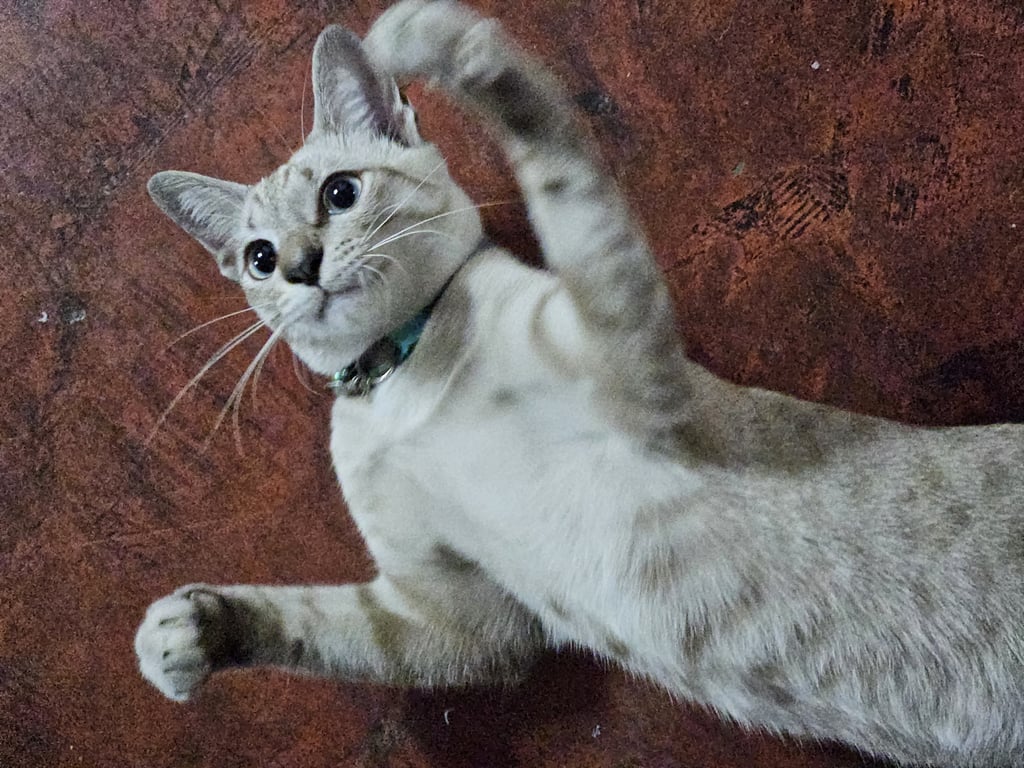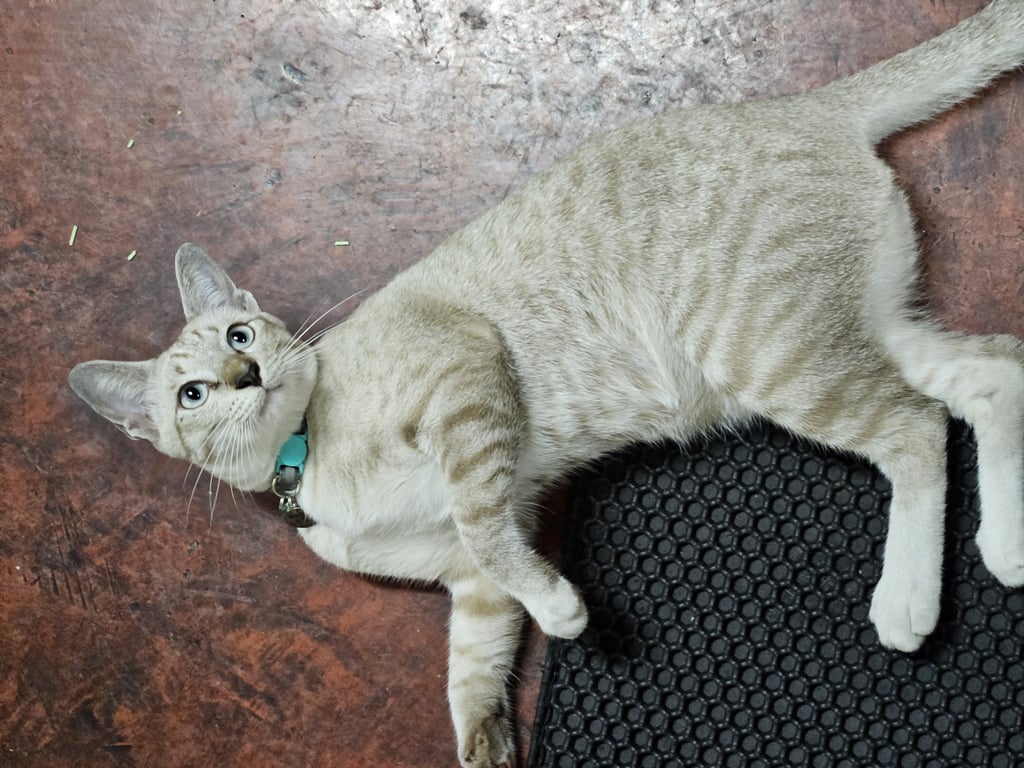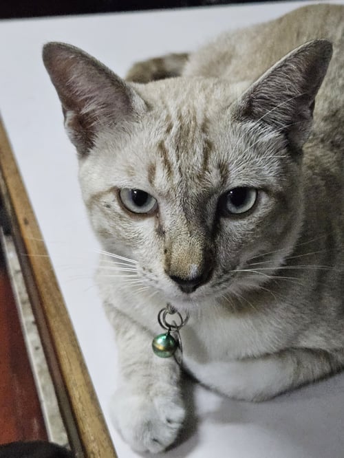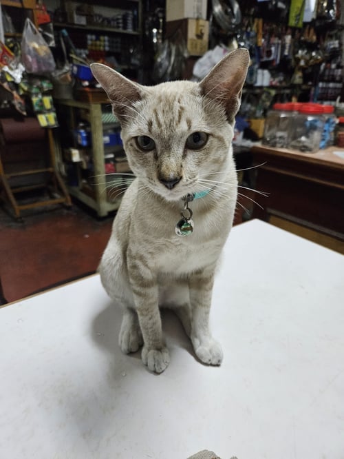 รอยตำหนิ: สลิดเทาอ่อน จมูกสีดำ หางยาว ปลอกคอสีฟ้าๆเขียวๆ มีแถบสะท้อนแสง มีป้ายชื่อและเบอร์ติดต่อขี้อ้อน ขี้ตกใจ