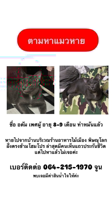 รอยตำหนิ: ปลายหางสีขาว ท้องสีขาวใส่ปลอกคอสีเขียว