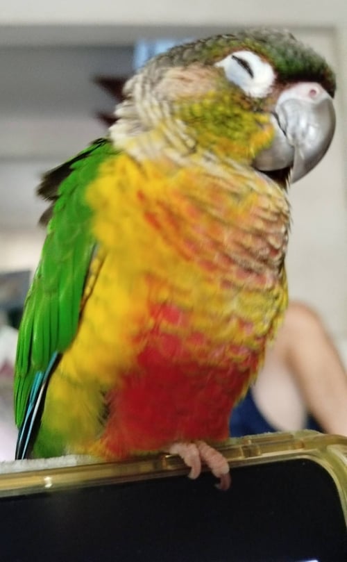 รอยตำหนิ: หัวมีรอยบุบเล็กๆนกแก้วพันธุ์กรีนชีค-เยลโลวไซด์ นิสัยขี้อ้อน ติดคน ให้คนจับได้ รู้จักชื่อตัวเอง ชอบร้องเสียงดัง จุดสังเกตุคือ **มีรอยบุบที่หัว**