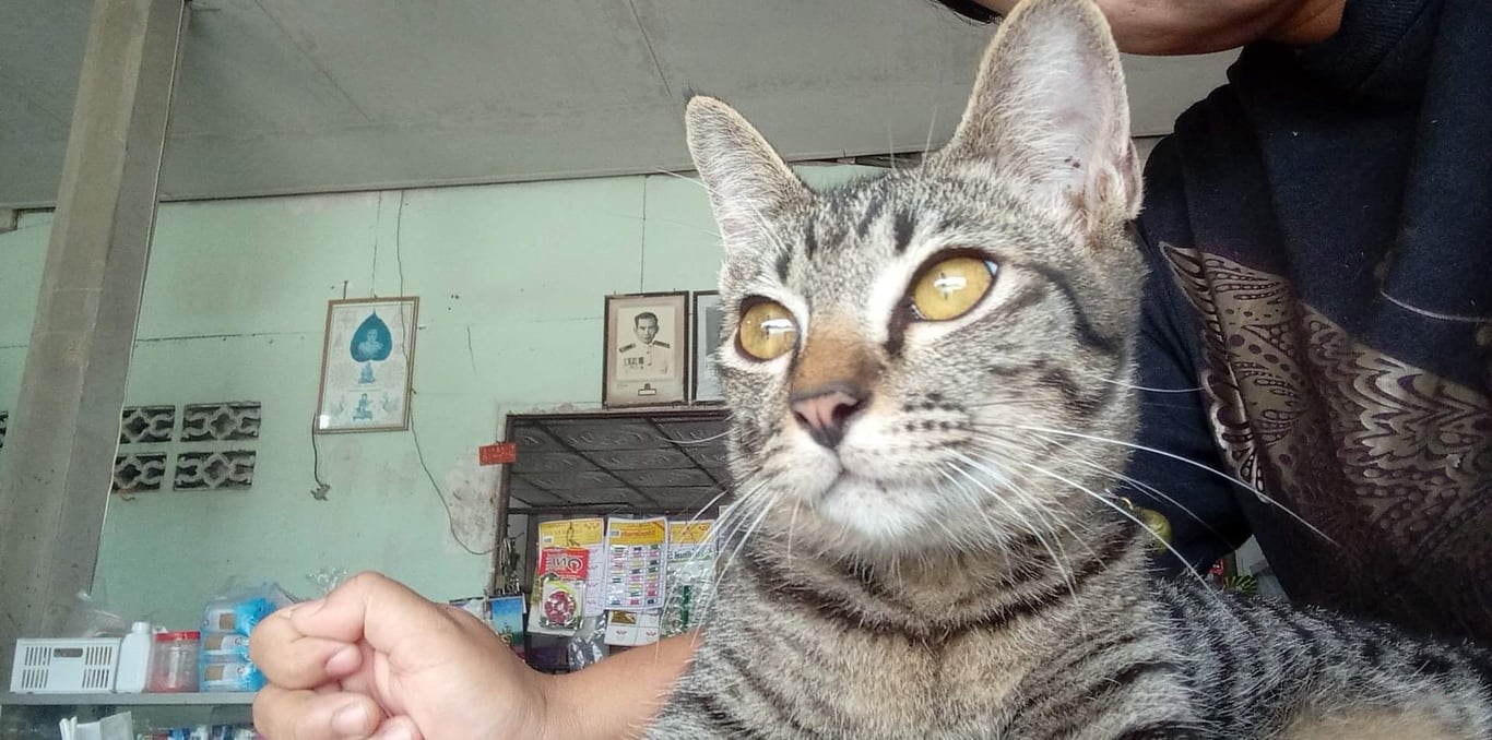 รอยตำหนิ: เป็นลูกแมวตาสีออกส้มๆ วันที่หายไปใส่ปลอกคอวินเทจสีแดงแบบในภาพ