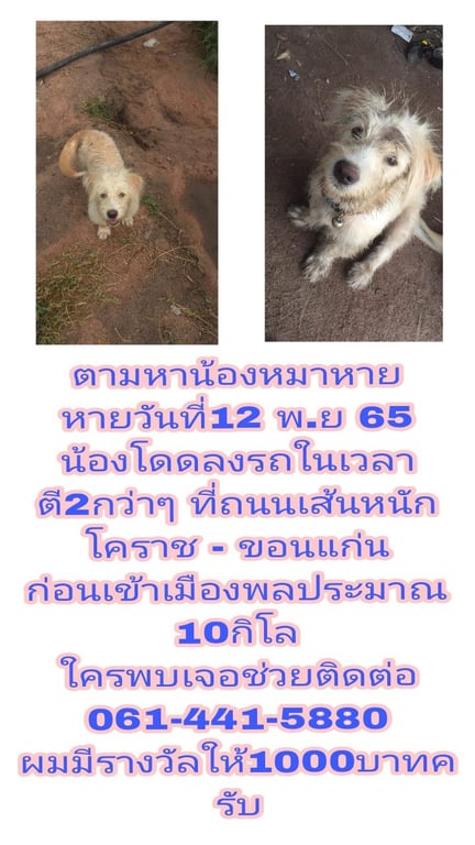 รอยตำหนิ: น้องอายุ7-8เดือน ยังไม่เคยมีลูกตัวเล็ก ขาสั้น ขนยาว หูตก หายไปวันที่12 พ.ย 65 ตี2กว่าๆ แถวบ้านเมืองสูง ก่อนถึง4แยกไฟแดงไปเมืองพล เส้นทางหนักเข้าขอนแก่น