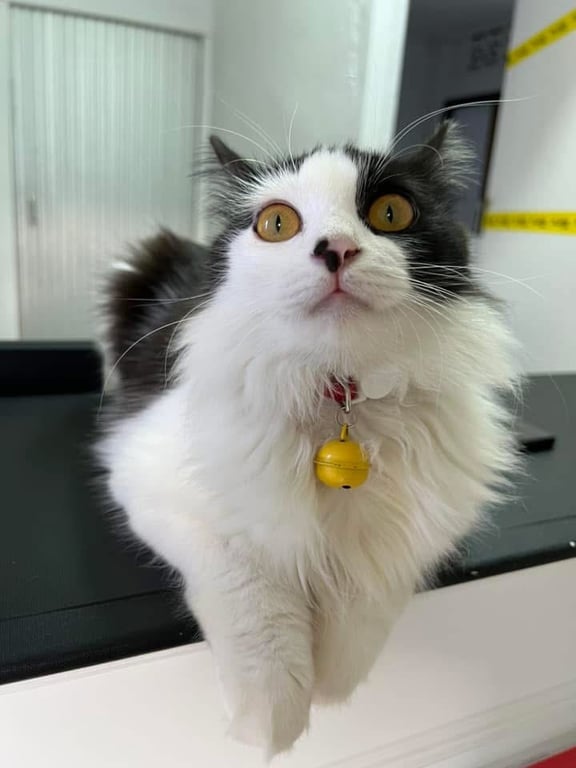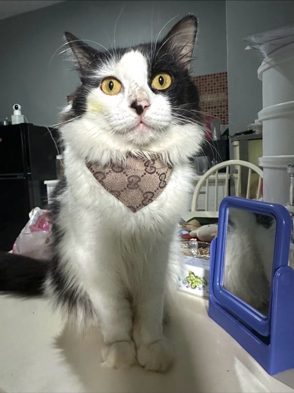 รอยตำหนิ: จมูกมีแต้มสีดำ ลายตาดำ 1 ข้าง หางดำล้วนนิ่งๆ ขรึม หากกัดจะข่วนแบบรวดเร็วแบบไม่ทันตั้งตัว เลือกกิน สุภาพ