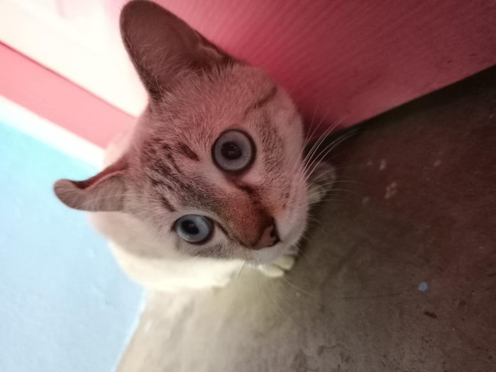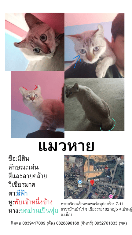 รอยตำหนิ: ตาสีฟ้า หูงอเข้า1ข้าง หางขดม่วนเป็นพุ่มขี้กลัว ชอบเสียงเขย่าถุงขนม