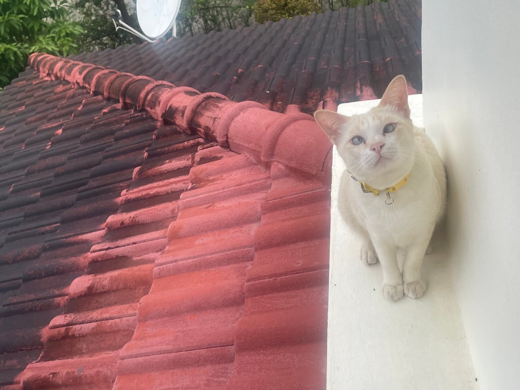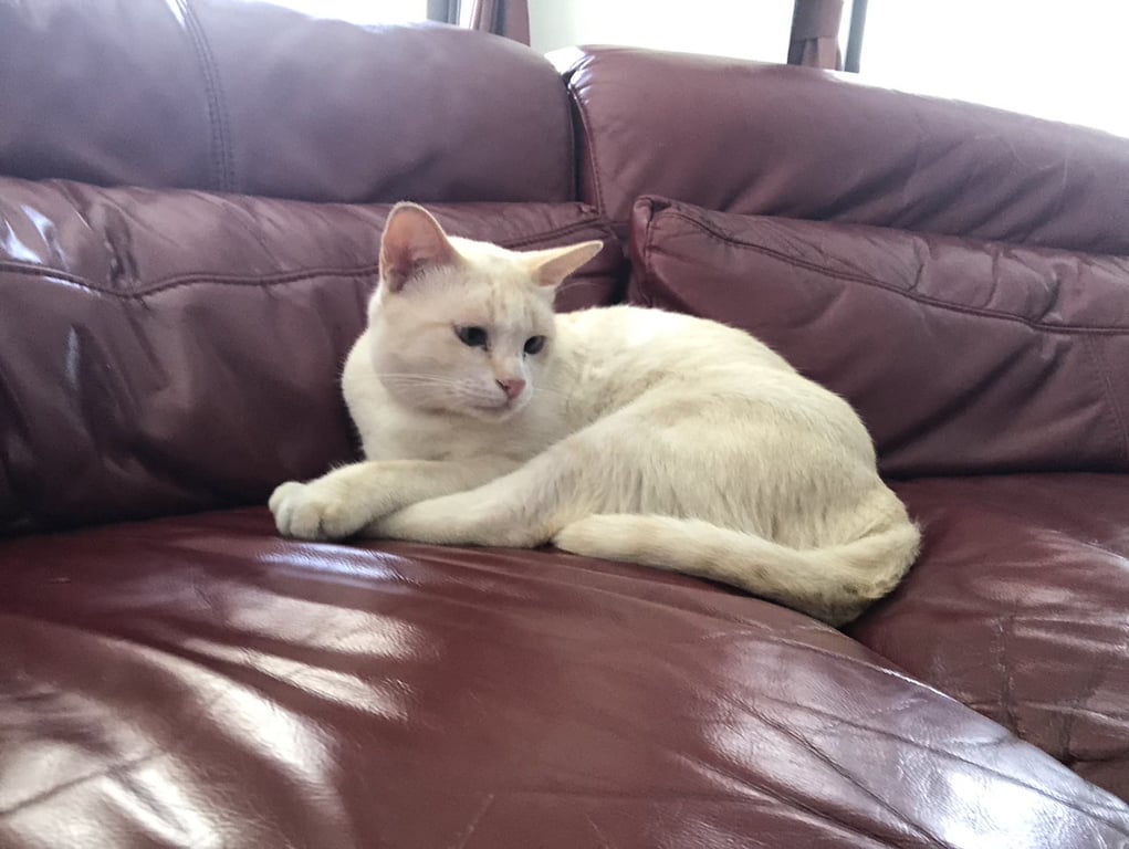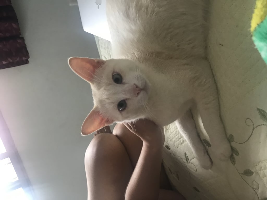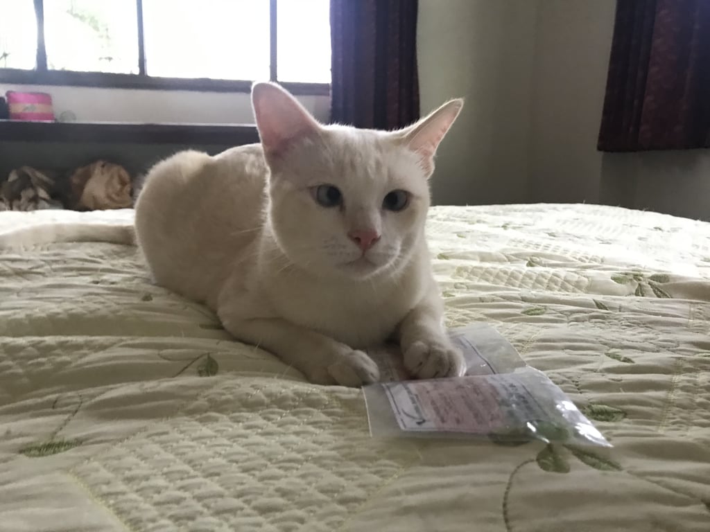 รอยตำหนิ: ตาเหล่นิดหน่อย ปลอกคอแดงแถบเทา อ้วนขาวแซมส้ม