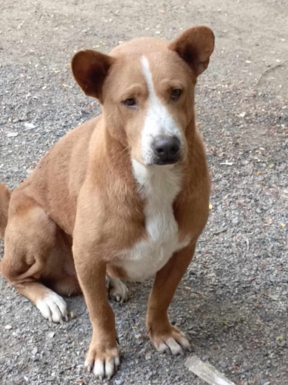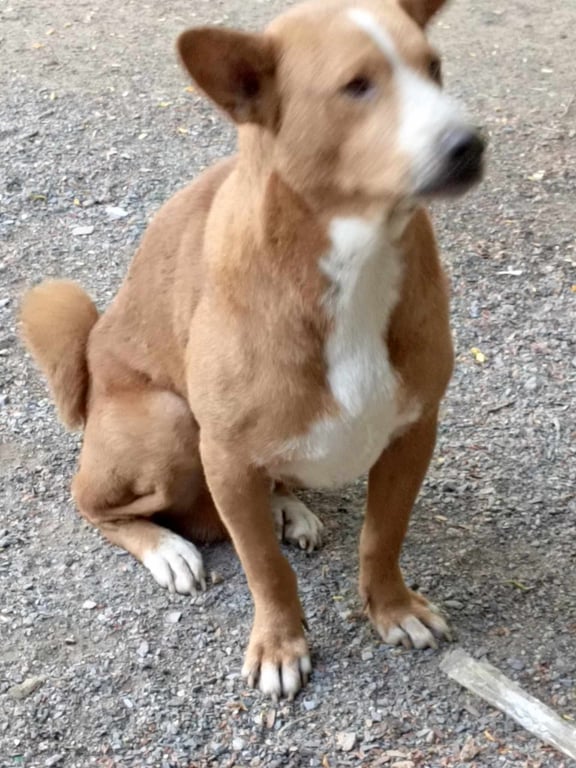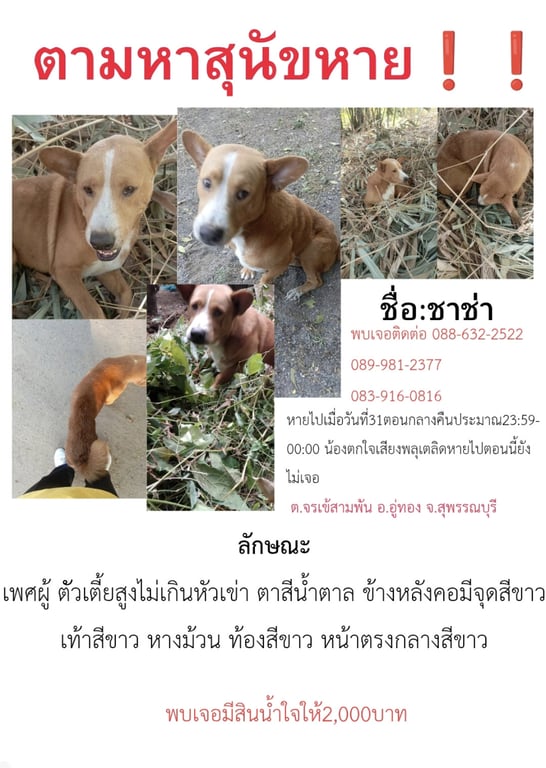 รอยตำหนิ: ข้างบนคอมีจุดสีขาวหลังคอนิดหน่อย หางม้วน ตัวเตี้ยไม่เกินหัวเข่าสีขนออกส้มๆน้ำตาล หน้าท้องสีขาว หน้าสีส้มผากด้วยสีขาว เท้าสีขาว หางม้วน ตัวเตี้ยประมูลหัวเข่า ตาสีน้ำตาล เป็นผู้ชาย