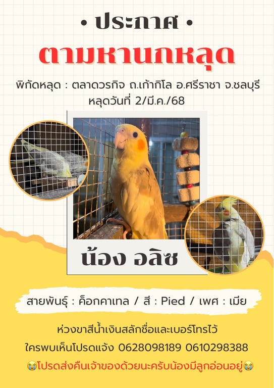 รอยตำหนิ: มีห่วงที่ขาสีน้ำเงิน หัวเหฃือง แก้มส้มเข้าหาคน แต่ไม่ให้จับ ตกใจ
