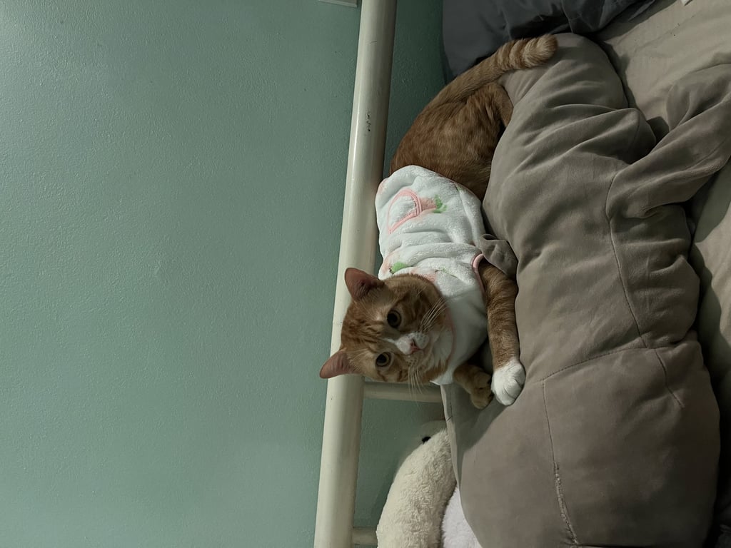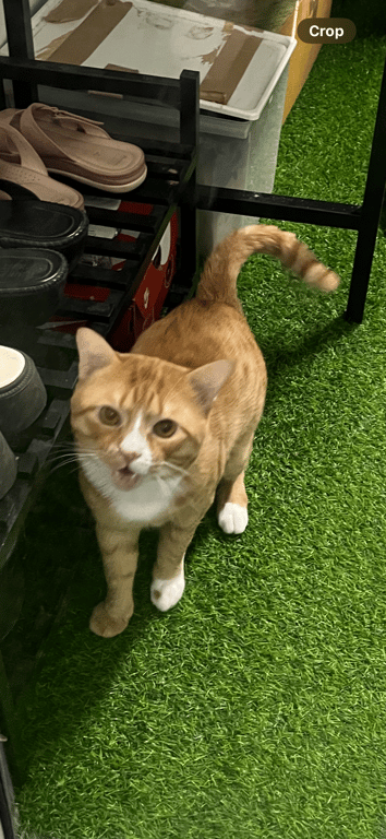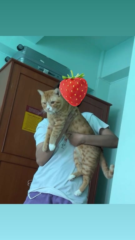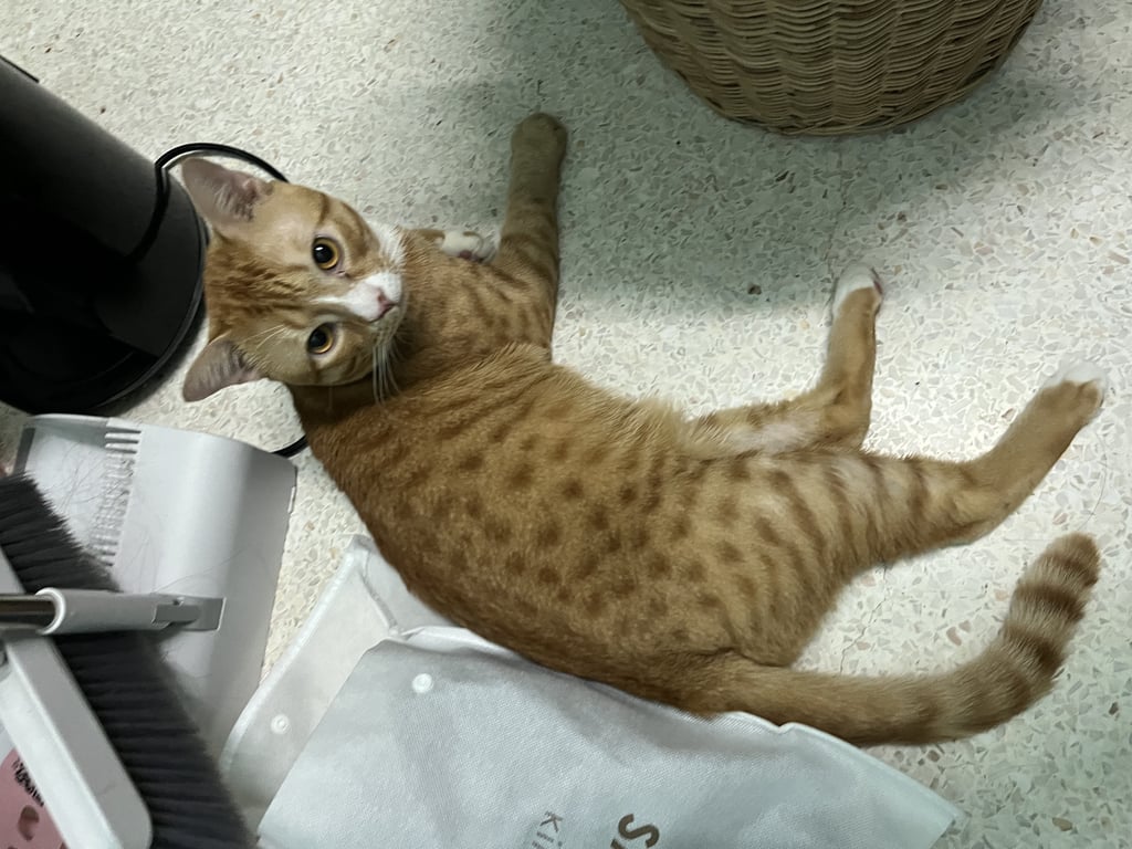รอยตำหนิ: มีถุงเท้าสีขาวยกเว้นเท้าข้างขวาหน้า ถุงเท้าข้างซ้ายหน้ามีปานสีส้มล้ายรูปหัวใจ ลายจุดสีส้ม ตัวค่อนข้างใหญ่ หางตรง ไม่มีปลอกคอขี้อ้อน เป็นมิตร แต่กลัวรถและที่คนพลุกพล่าน