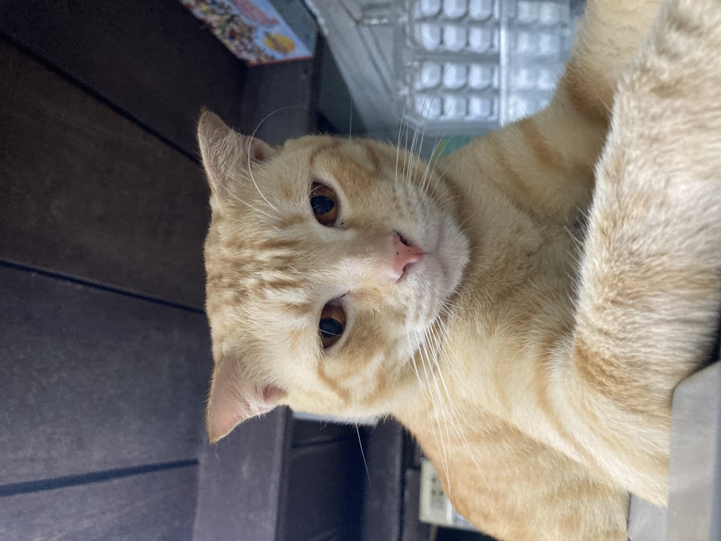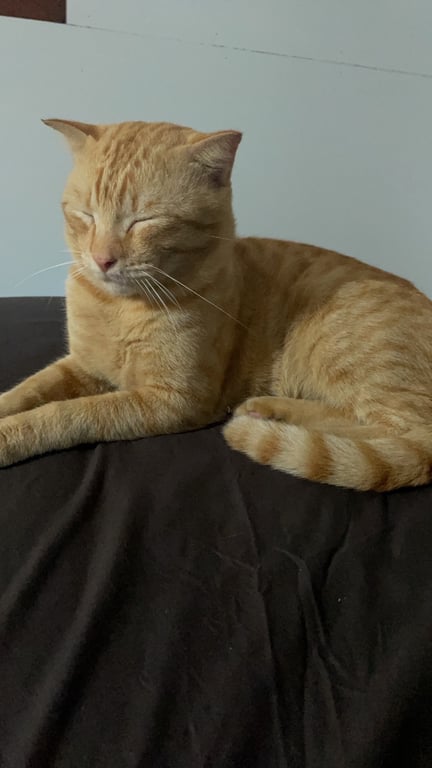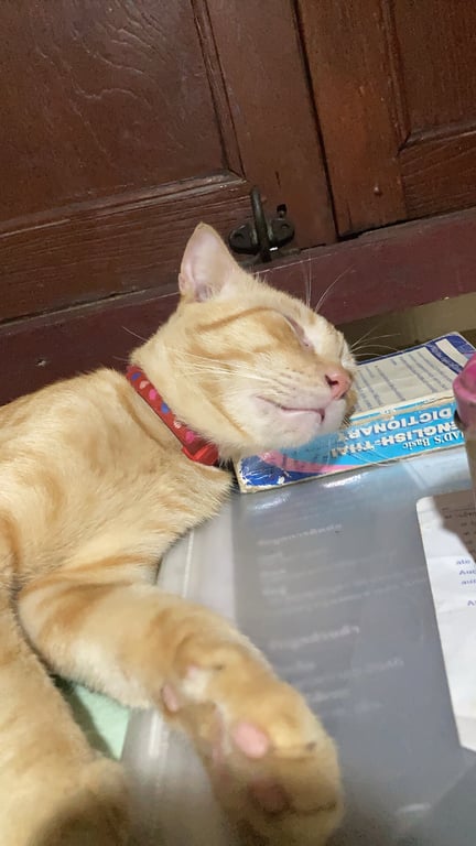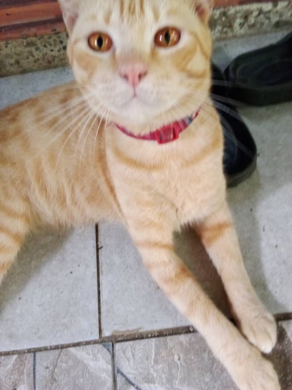 รอยตำหนิ: มีรอยโกนขน ตรงขาหน้า หูเล็ก ใส่ปลอกคอสีแดง ลายหัวใจ มีสายเคเบิลไทสีดำรัดตรงปลอกคอตาสีส้ม