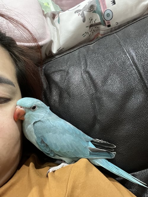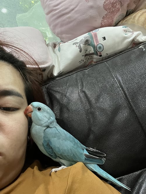 รอยตำหนิ: นกแก้วริงเนค สีฟ้า มีห่วงขาน้องเป็นลูกป้อน หัดบิน ทานเองยังไม่ได้