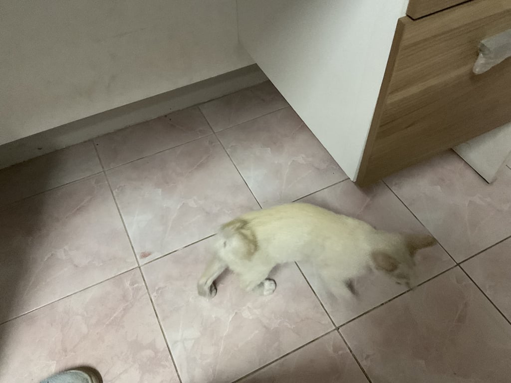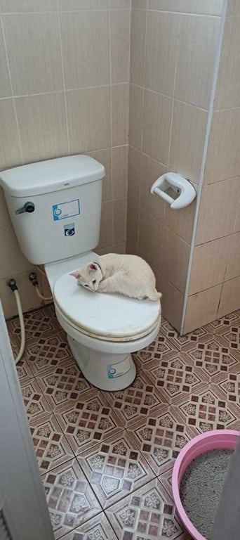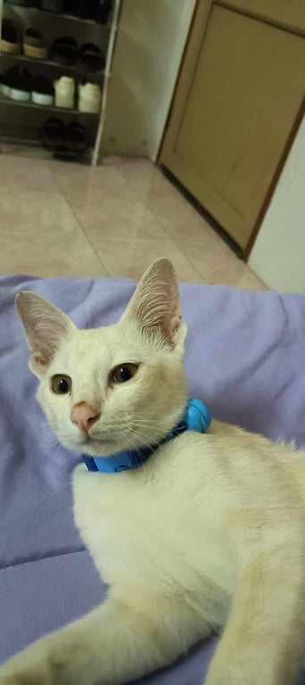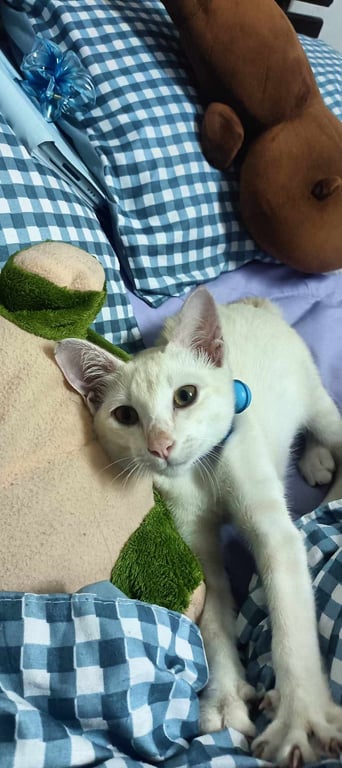 รอยตำหนิ: ตาสีเหลือง หางกวักโค้งไปทางขวา เป็นแมวขาวที่มีสีน้ำอ่อนๆมึนๆ วิ่งไม่หรือทรงตัวไม่คล่องแคล่วเหมือนแมวตัวอื่นๆ เพราะเคยประสบอุบัติเหตุ ขี้สงสัย ชอบนอนที่เย็นๆเช่น พื้นกระเบื้อง กินง่าย