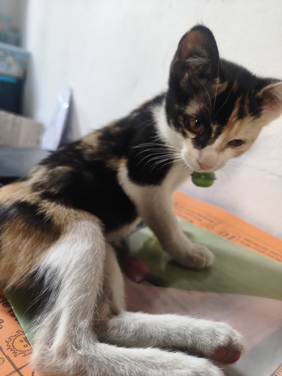 รอยตำหนิ: ครึ่งหน้าขวาเป็นสีดำครึ่งซ้ายเป็นสีขาวผสมส้มค่อนข้างที่ระแวงแต่ถ้าสนิทน้องจะขี้อ้อนน้องเสียงเบาตัวเล็กร่างกายน้องค่อนข้างไม่ค่อยแข็งแรงเท่าไหร่