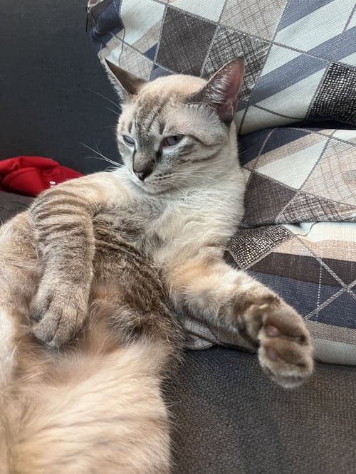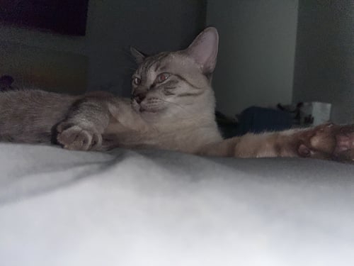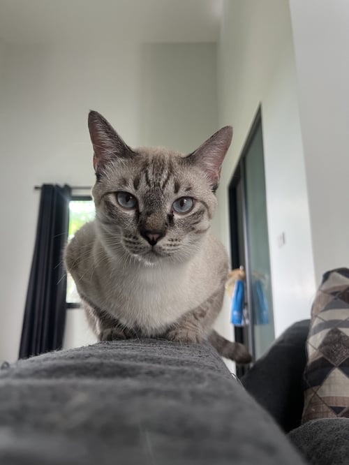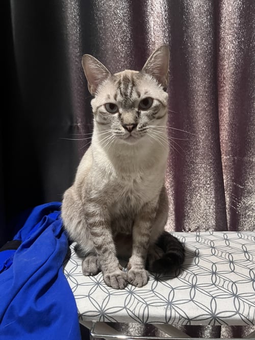 รอยตำหนิ: ตาสีฟ้า ตัวโต สีขนจะออกสีขาวครีม ลำตัวมีสีเข้ม มีลายตามขา หาง ใต้ท้อง มีลักษณะแต้มดำคล้ายวิเชียรมาศนิสัยไม่ดุร้าย จับได้ ขี้กลัวนิดๆ