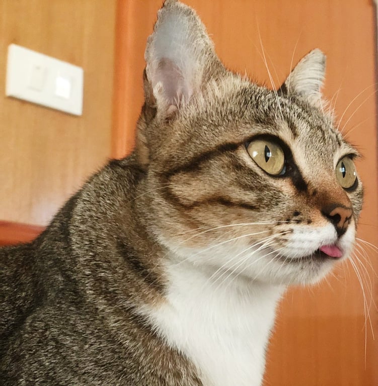 รอยตำหนิ: ใบหูหยักๆ ชอบแลบลิ้นใต้ท้องจะขาวมาก น้องมีถุงเท้าสูง