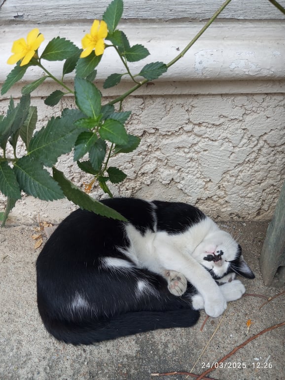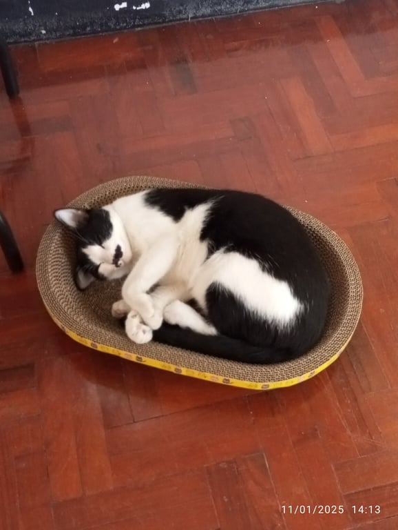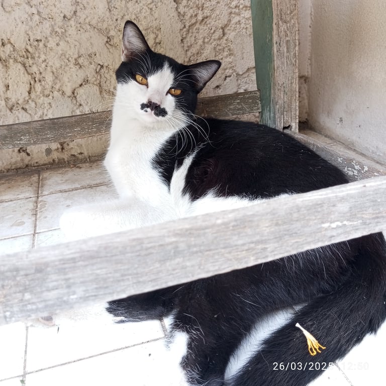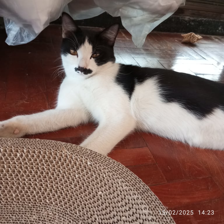 รอยตำหนิ: มีแต้มสีดำเหมือนหนวด ด้านข้างฝั่งขวาตรงบริเวณกัวไหล่สีดำจะเป็นรูปหยักเหมือนรูปหัวใจน้องถูกขอไปเลี้ยงตอนอายุ 2 เดือนในระบบปิด4เดือน จากนั้นคนขอไปเขาเลี้ยงต่อไม่ได้ จึงขอรับคืนกลับมา แต่ที่บ้านเลี้ยงแบบระบบเปิดทุกตัว ก่อนปล่อยน้องเดินเล่นตามบริเวณบ้านได้สร้างความคุ้นเคยต่างๆให้น้องแล้ว1เดือนกว่าๆ น้องเข้ากับพี่หมาที่บ้านได้แต่เข้ากับแมวตัวอื่นซึ่งเป็นพี่น้องกันไม่ค่อยได้เนื่องจากน้องเล่นไม่เป็นน้องเล่นแรง น้องเป็นตัวผู้ที่เสียงเล็กเสียงอ้อนๆ ชอบให้เจ้าของอุ้ม กำลังจะพาไปทำหมันแต่น้องหายไปก่อนแผ่นดินไหว 1 คืน (ที่น้องไม่ได้สวมปลอกคอเนื่องจากทุกครั้งที่สวมให้น้องจะแอบดึงออกแล้วจะค้างรัดอยู่ตรงปากน้องแล้วน้องจะเจ็บและตกใจมากค่ะ)