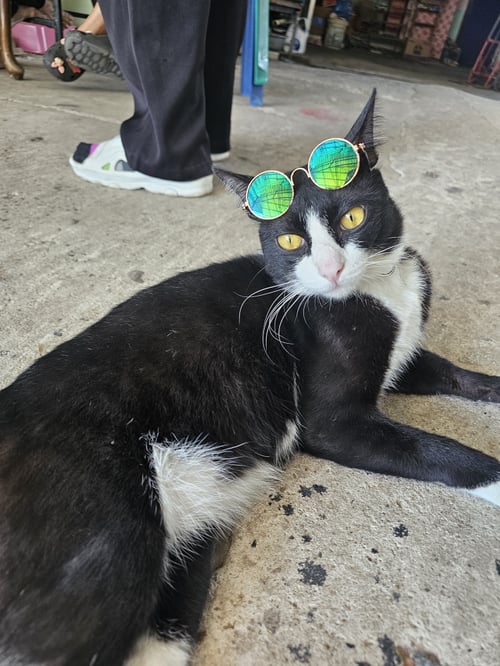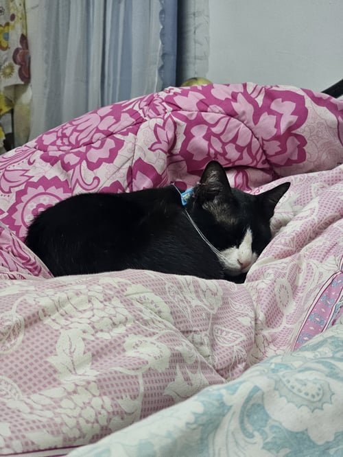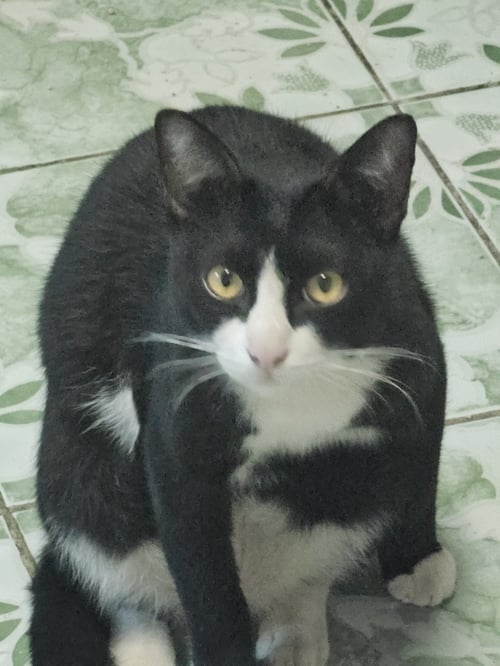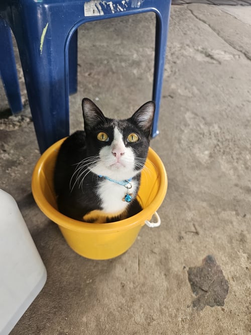 รอยตำหนิ: ตัวดำ หน้าขาว หางตรงยาว ใส่ถุงเท้าเป็นแมวเชื่อง ชอบนอน ไม่ค่อยออกไปไหน