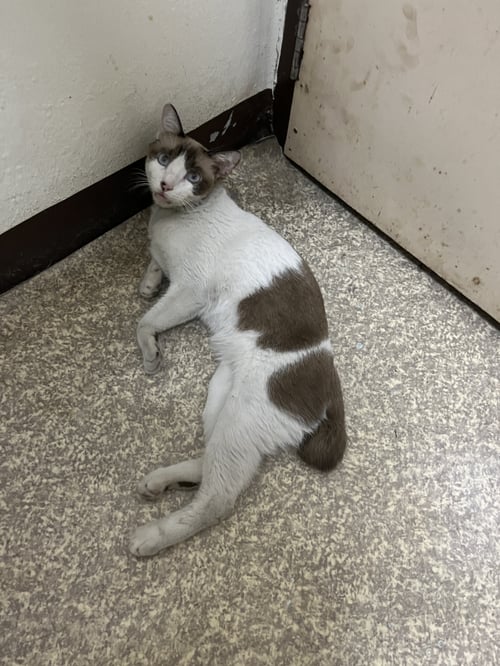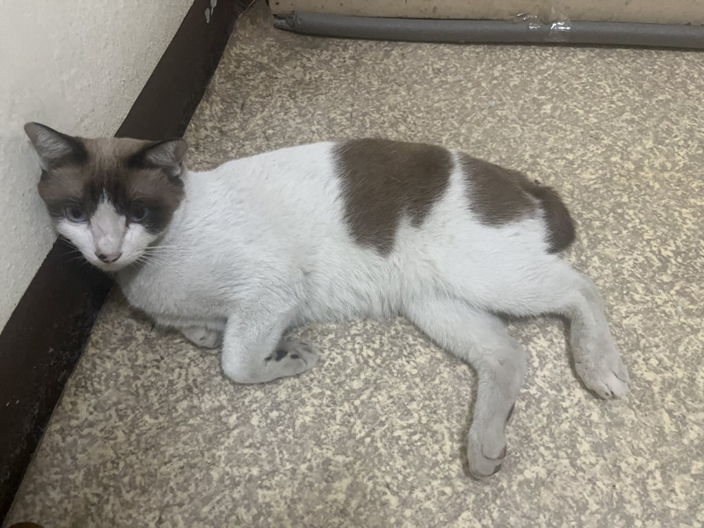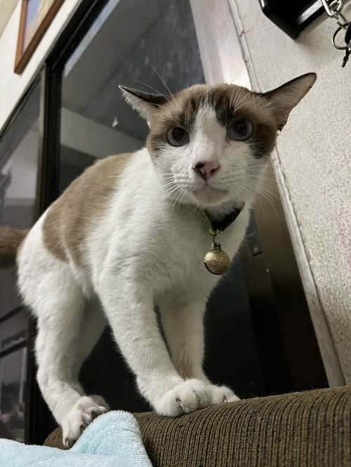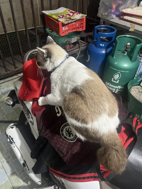 รอยตำหนิ: หางเป็นตุ้มๆ มีไฝที่จมูก ตาสีฟ้าแมวสีขาวน้ำตาล ตาฟ้า มีไฝที่จมูก ตัวยาว หางขดเป็นก้อนๆ