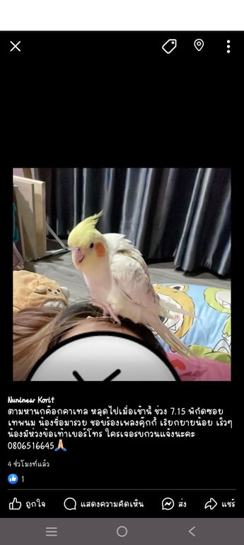 รอยตำหนิ: มีห่วงเปิดข้อเท้า 1 ข้าง ห่วงปิดมีชื่อนกพร้อมเบอร์โทรเจ้าของ 1 ข้างชอบร้องเพลงคุกกี้ เรียกยายน้อยเร็วๆ แล้วชอบทำเสียงจุ๊บ