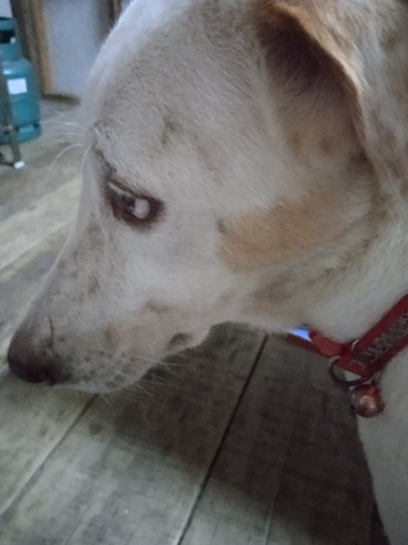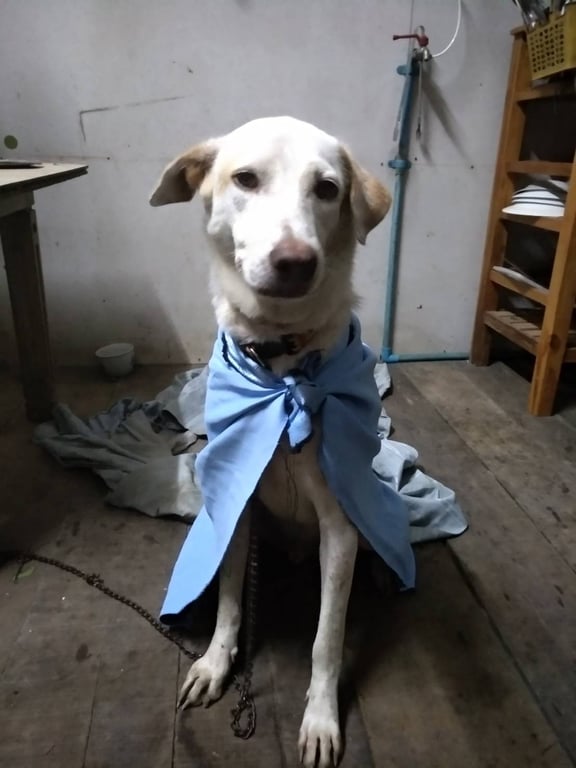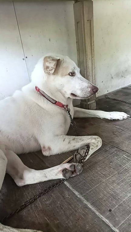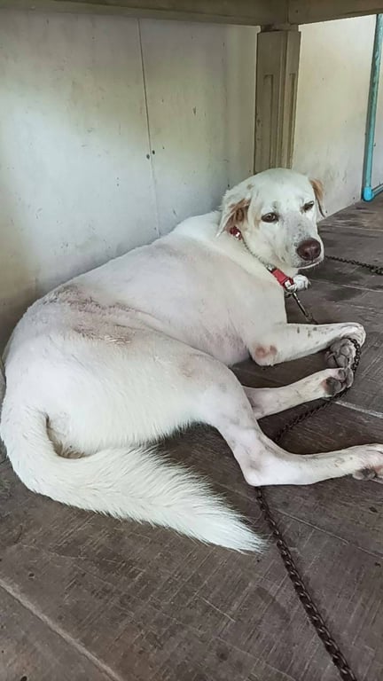 รอยตำหนิ: หูสองข้างมีสีน้ำตาลอ่อน แก้มซ้ายมีแต้มสีน้ำตาลอ่อน ตาซ้ายมีแต้มเล็กๆสีน้ำตาลอ่อน ใส่ปลอกคอสีแดงน้ำหนักประมาณ27กิโล ตัวสูงหน่อย