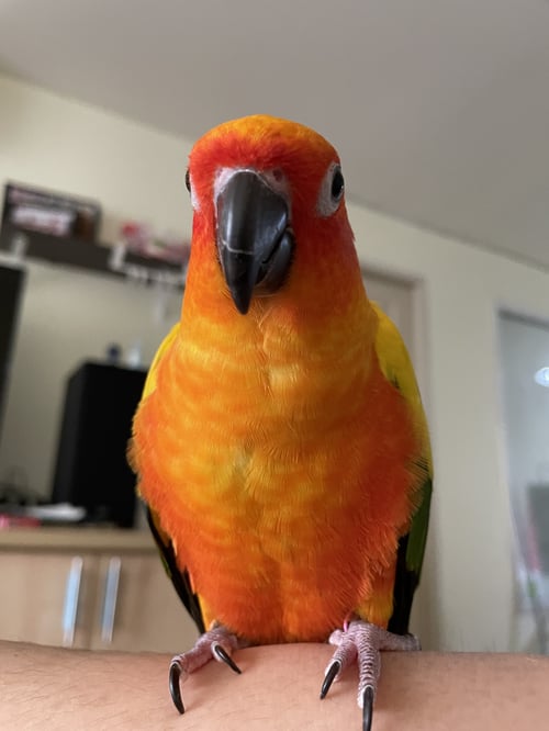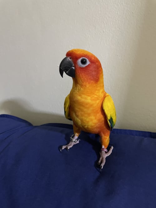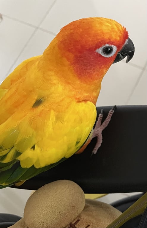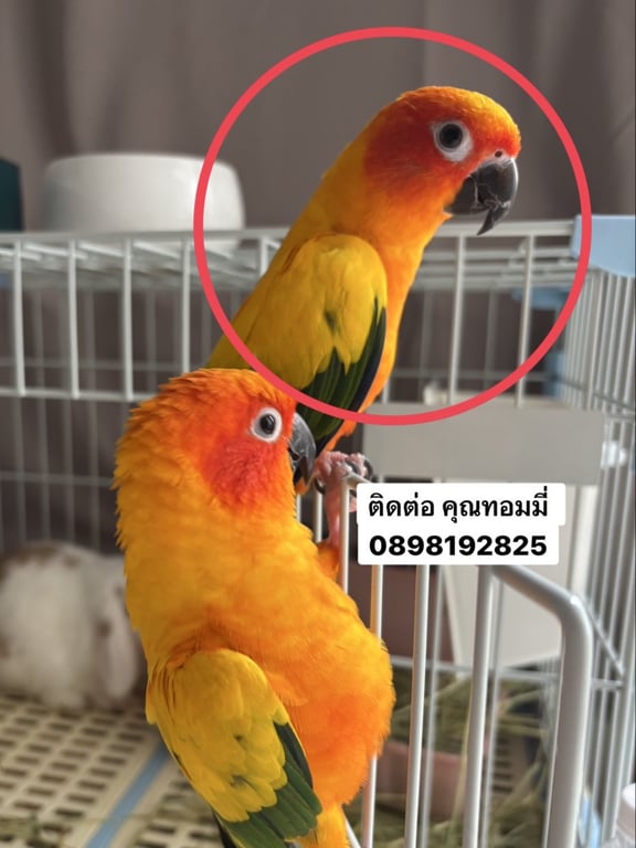 รอยตำหนิ: ตาโต จะมีวงสีขาวๆรอบดวงตาชัด มีห่วงขาข้างซ้ายสีชมพู สลักว่า “เรน 0610825809”พูดคำว่า ”เจ้ยครับ“ ได้ เป็นนกมึนๆ จะติดนกอีกตัวมาก อ้วน ขนเหลืองเยอะ ชอบกินอาหารคน ขนมปัง