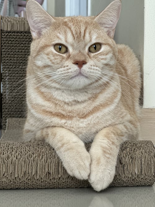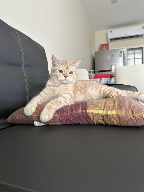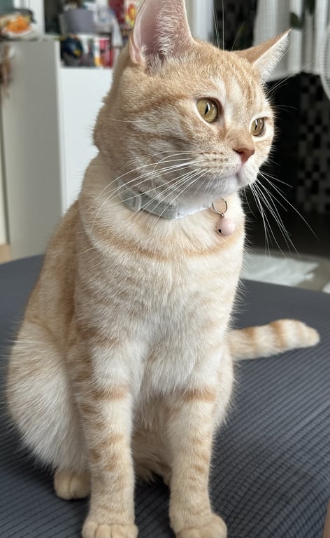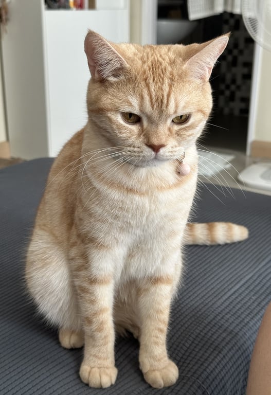 รอยตำหนิ: ขนใต้เท้าหลังสองข้างสีน้ำตาลส้มเข้มค่อนข้างขี้กลัว และเป็นโรคชัก ต้องทานยากันชักทุกวัน