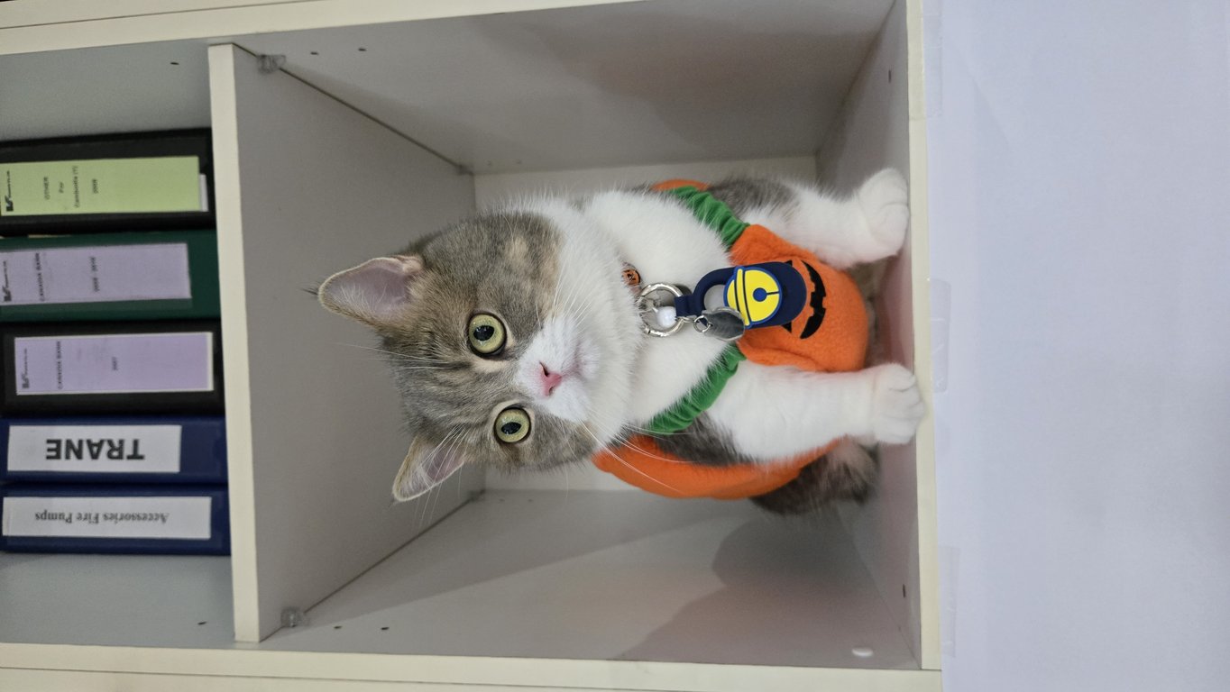 รอยตำหนิ: ขาสั้น ลายสลิต ขาวเทา มีน้ำตาลอ่อนแซมหน้าเหวี่ยง ขี้ตกใจ แต่ชอบนั่งเล่นดูคน