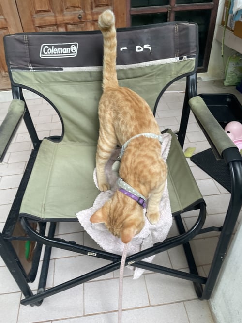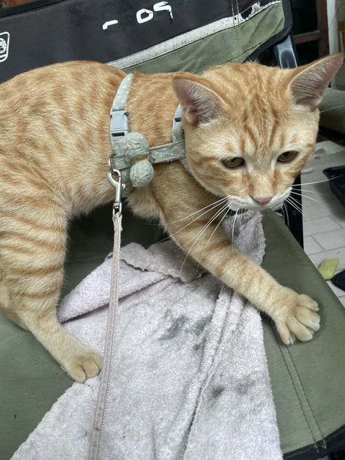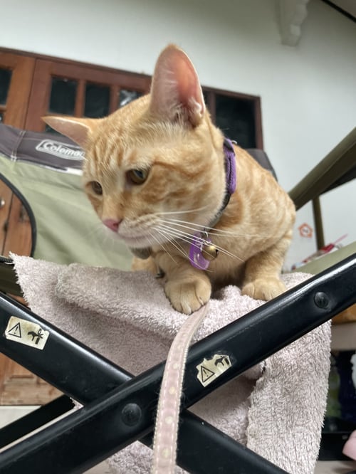 รอยตำหนิ: ปลายหางหงิกๆ ขนสั้น ปลอดคอสีม่วงมีป้ายชื่อ ใส่สายคล้องสำหรับจูงด้วยสีฟ้ากินเก่งมาก ชอบตบๆ ร้องโวยวายบ้าง